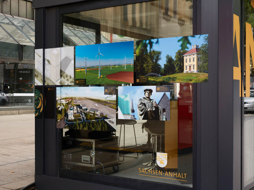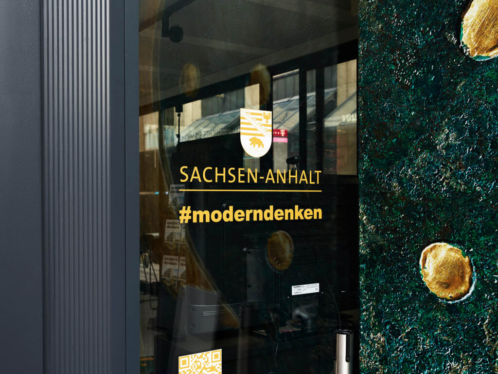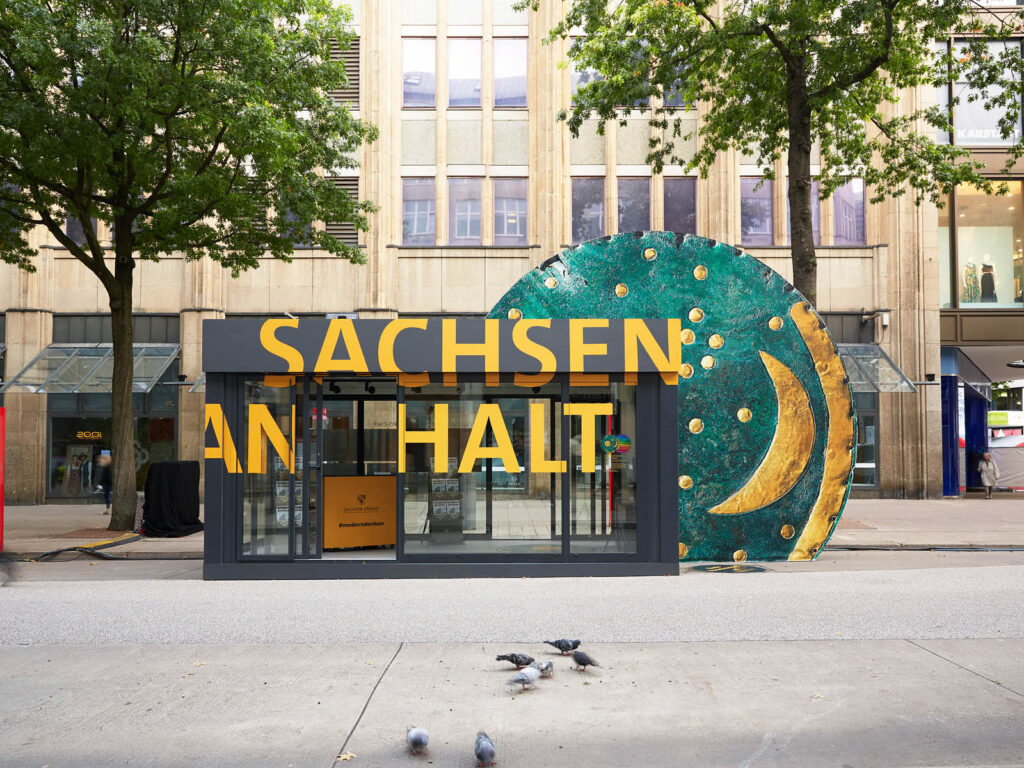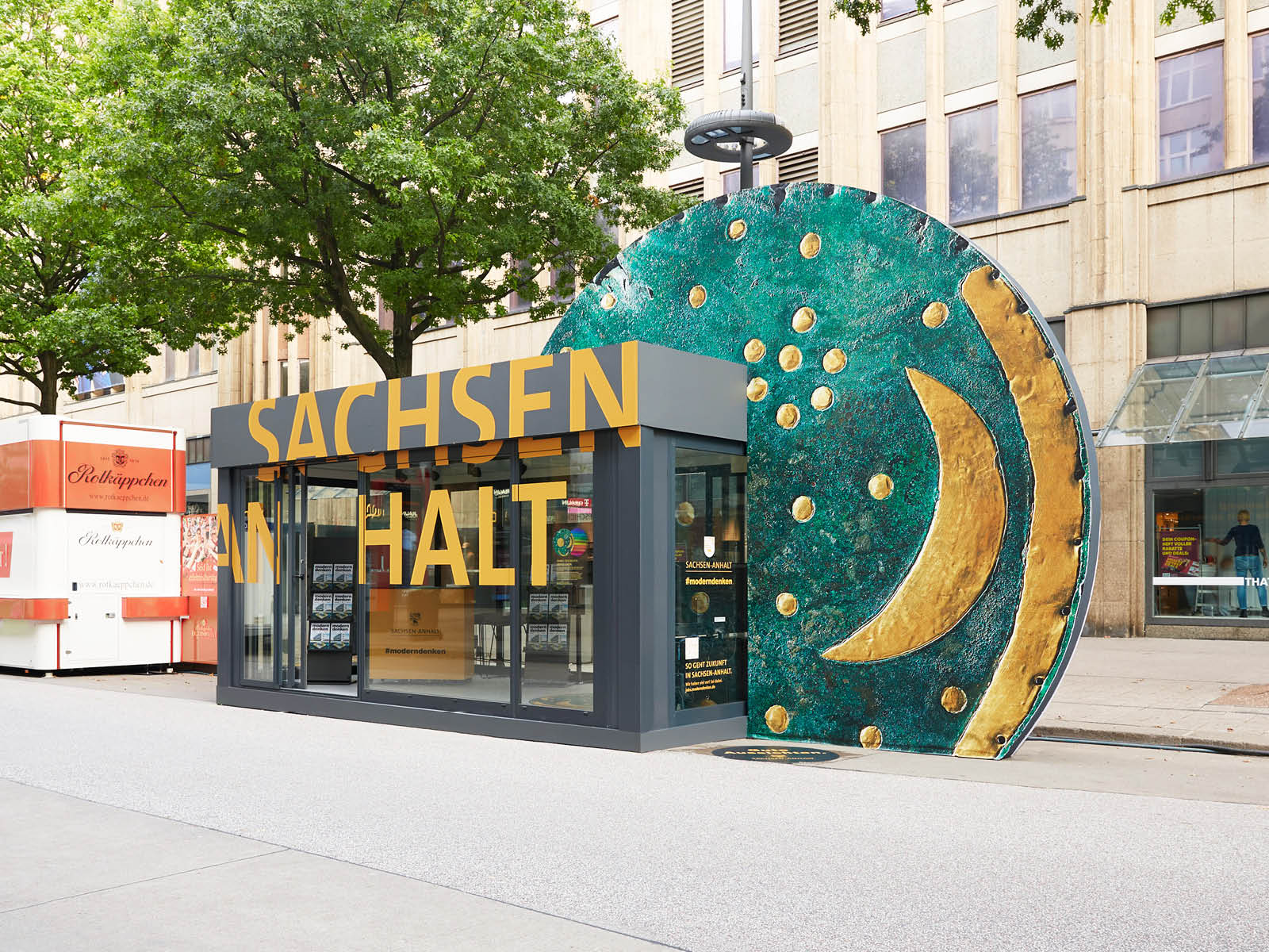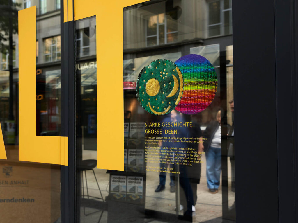Im heutigen Sachsen-Anhalt haben kluge Köpfe weltverändernde Ideen entwickelt: Von der Himmelsscheibe über Martin Luther bis zum Bauhaus. Studio Oeding zeigt diese Reise anhand der fünf Meter hohen Himmelsscheibe, die aus dem Pavillion herausragt. Auf der Rückseite wird diese Scheibe zum Microchip, der die Intel-Fabrik in Sachsen-Anhalt vorstellt, welche die Zukunft des Landes beeinflussen wird.