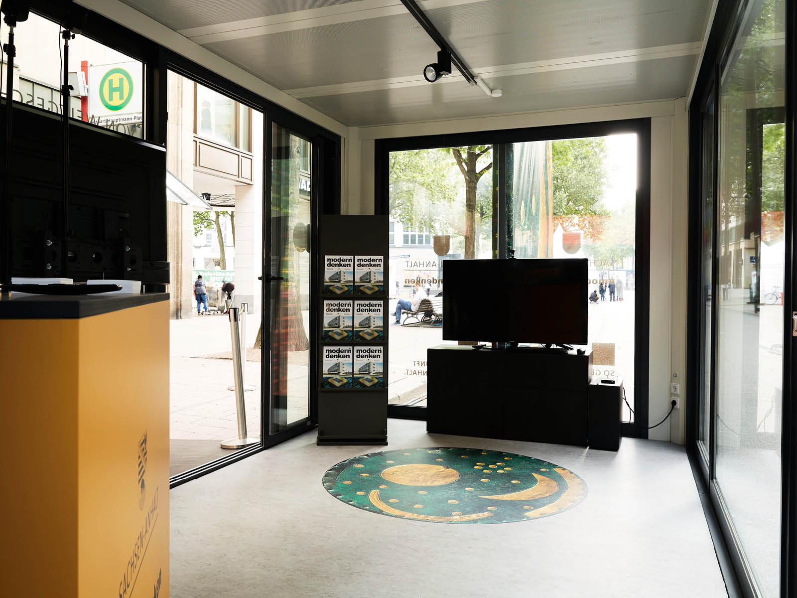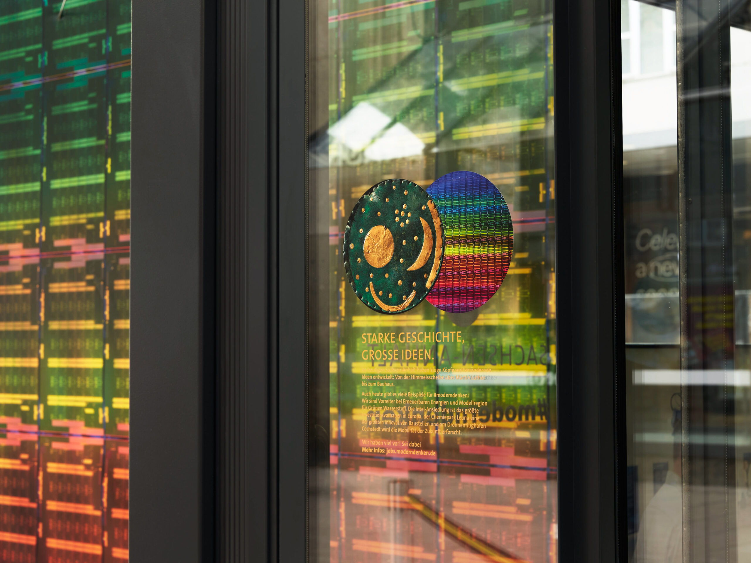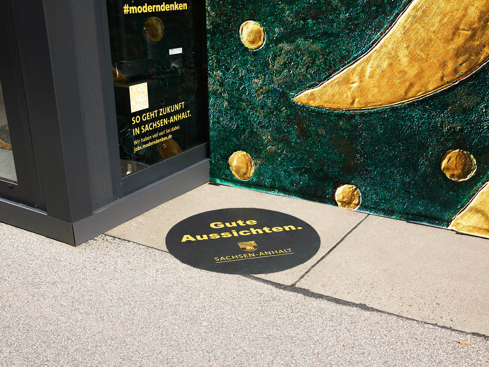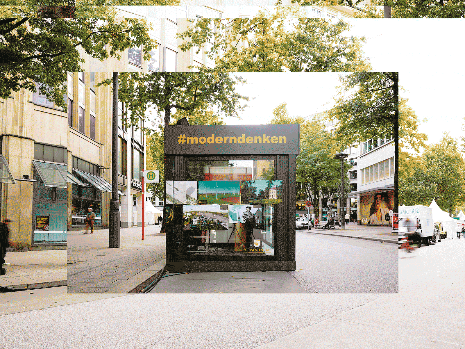 Im heutigen Sachsen-Anhalt haben kluge Köpfe weltverändernde Ideen entwickelt: Von der Himmelsscheibe über Martin Luther bis zum Bauhaus. Studio Oeding zeigt diese Reise anhand der fünf Meter hohen Himmelsscheibe, die aus dem Pavillion herausragt. Auf der Rückseite wird diese Scheibe zum Microchip, der die Intel-Fabrik in Sachsen-Anhalt vorstellt, welche die Zukunft des Landes beeinflussen wird.